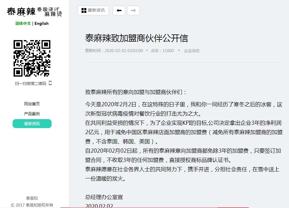 在共同利益受损的情况下,为了企业实现KPI的目标,公司决定拿出企业3年的净利润2亿元,用于减免中国区泰麻辣店面加盟商的加盟费(减免所有泰麻辣加盟商的加盟费,不含泰国、韩国、美国)。