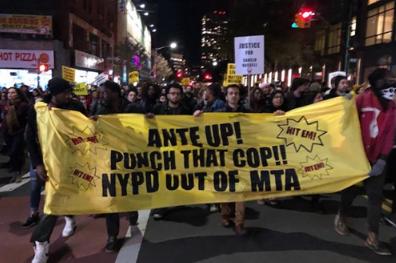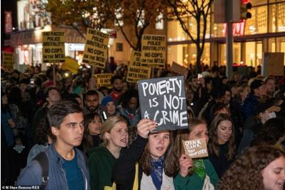 11月1日当晚,示威者举着的“贫穷不是犯罪”、“不需要新警察”、“我们的地铁需要更多钱修电梯,而不是警察”等字样的标语牌,抗议纽约州政府的决定。《每日邮报》认为,示威者的标语反映了游行的双重性质。